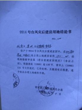 方黎辉老师1987年从学校毕业后即分配在莆田市城厢区棠坡小学任教,同年他的户口亦迁在该村。2000年,政府有关人士告诉他,城厢区土地局有1000多万元的罚款任务没有完成,允许个人以“9914台风灾后重建家园”的名义向私人购买土地建房。出于居住和家族生意的需要,方黎辉老师在棠坡村蔡坨村民的手里购得了一处旧房和一些过角地,共计900平方米,改造和新搭共计778平方米,当时城厢区土地局向他开具了《土地违法行为处理通知书》和《9914号台风灾后建房用地结论书》,并开具了福建省罚没款收据,属“以罚代批”;但到了2006年城港大道城厢段项目征拆时,却被以“外地人”为由不予安置,房屋也只能按150元一平方米计算。以外地人为由不予安置合理吗?房屋安置不是以房屋占地面积和建筑面积进行计算吗?