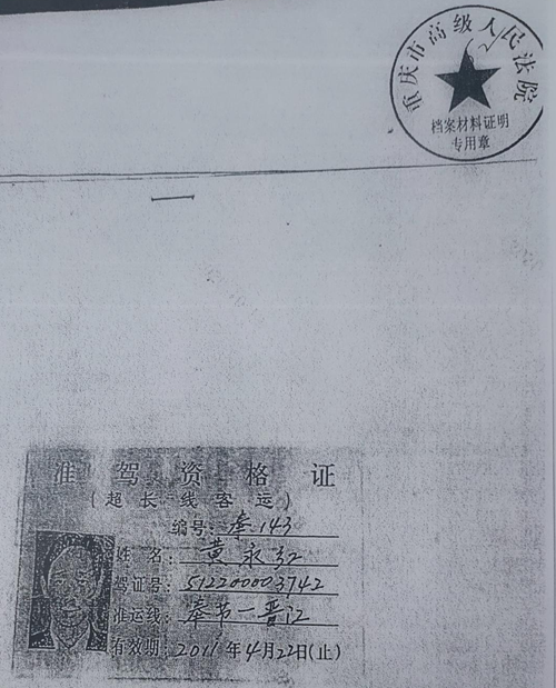 上图:黄永红在重庆万州汽车公司的准驾资格证