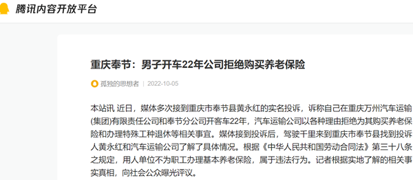 本站讯 近日,媒体多次接到重庆市奉节县黄永红的实名投诉,诉称自己在重庆万州汽车运输(集团)有限责任公司和奉节分公司开客车22年,汽车运输公司以各种理由拒绝为其购买养老保险和办理特殊工种退休等相关事宜。媒体接到投诉后,驾驶千里来到重庆市奉节县找到投诉人黄永红和汽车运输公司了解了具体情况。根据《中华人民共和国劳动合同法》第三十八条之规定,用人单位不为职工办理基本养老保险,属于违法行为。记者根据实地了解的相关事实真相,向社会公众曝光评议。