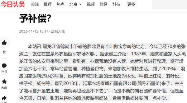本站讯 黑龙江省鹤岗市下辖的萝北县有个叫做宝泉岭的地方,今年已经70岁的张淑兰,就住在宝泉岭农垦延军农场20队。据张淑兰介绍:1987年,她就和全家人从黑龙江省的依安县来到这里,看到有一些撂荒地没有人管,她就对其进行整理,逐年增加至六七十亩,常年经营管理,种植些谷物,来增加收入维持生活。到了2009年,响应国家退耕还林的号召,她将所有整理过后的土地改为林地,种植上红松、落叶松、樟子松、杨树等。直到2018年,延军农场春晖石墨有限公司(简称石墨矿)来了,并占了她私自开垦的土地,她就再也经营不下去了,而是不断的向石墨矿要补偿,但是至今无果。日前,张淑兰将她的遭遇反映到媒体,希望借助媒体要回一点补偿。