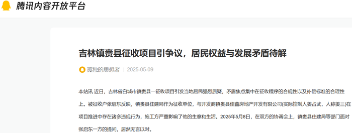 本站讯 近日,吉林省白城市镇赉县一征收项目引发当地居民强烈质疑,矛盾焦点集中在征收程序的合规性以及补偿标准的合理性上。被征收户张启东反映,镇赉县住建局作为征收单位,与开发商镇赉县佳鑫房地产开发有限公司(实际控制人姜占武,人称姜三)在项目推进中存在诸多违规行为,施工方严重影响了他的生意和生活。2025年5月8日,在双方的协调会上,镇赉县住建局等部门面对张启东一方的提问,居然无言以对。