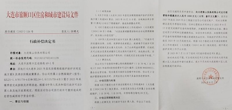 《行政补偿决定书》“补偿及限期搬离决定”一栏载明:根据上述事实及《行政许可法》第八条,作出以下决定,由住建局负责申请资金,向银山供热支付经营性补偿共计人民币1000万元,款项自2027年起至2029年分三期拨付你公司指定账户,同时,限定2025年7月16日前完成锅炉设备的物理隔断,并搬离原有换热站设备……