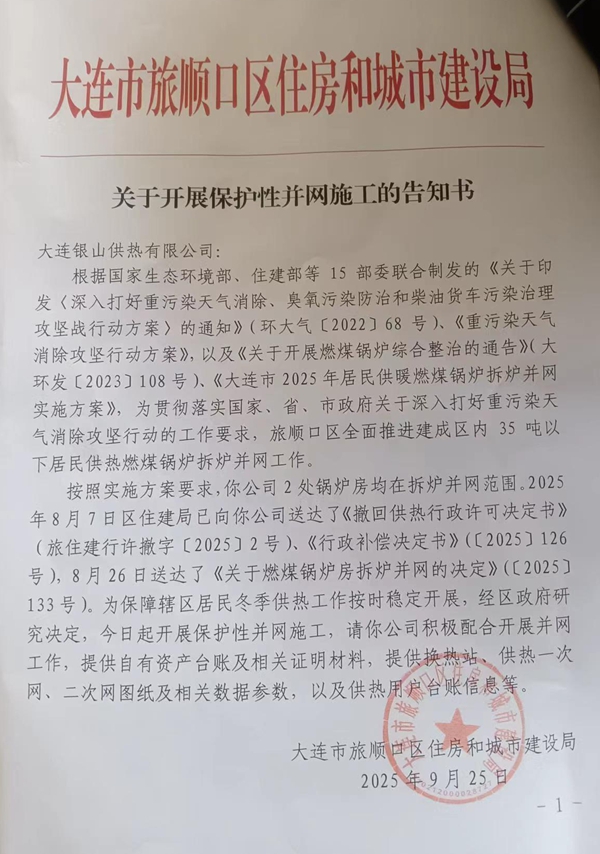 9月26日,大连盛阳供热有限公司变更新法人,9月25日,住房局就提前下发了“强并网文件”,将最初规划并入学园供热强行改为并入大连盛阳供热有限公司。而变更前后的两任法人从未与银山供热负责人张丽卿协商补偿意向,住建局提前用行政文件驱离民企“关停”,致使银山供热资产遭到强拆强占。