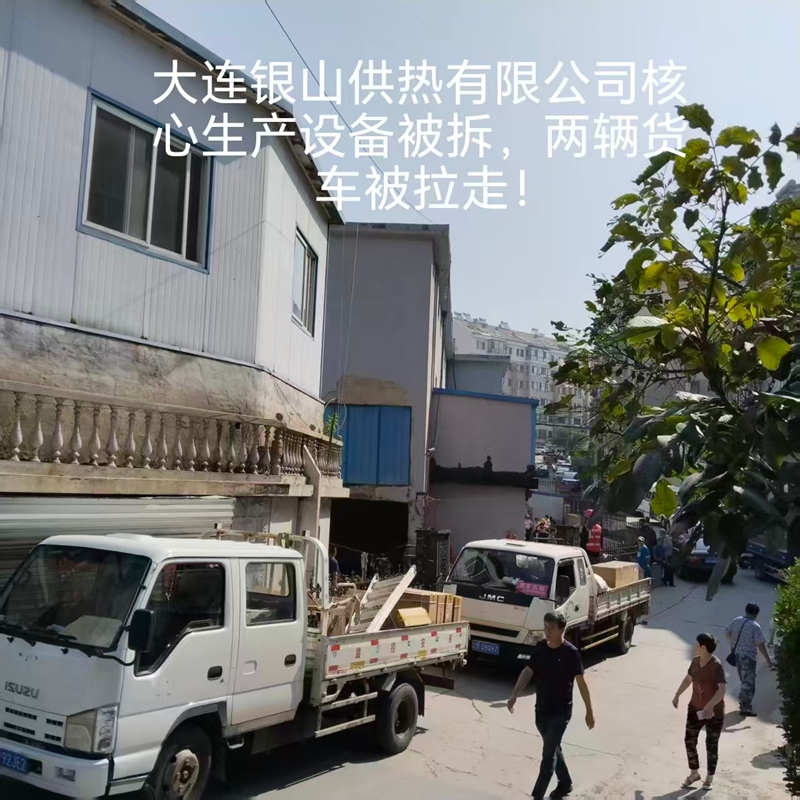 到了9月29日上午8时许,住建局、综合执法局人员在没有出示执法证件的情况下就对企业进行查封,在没有与企业达成补偿协议的情况下,雇佣民工对银山供热的供热设备核心部件(变频器等)进行强拆,当日,用两辆货运汽车拉走强拆下来的供暖设备,驱离工人14人,并拉走住宿工人的行李,还以大连市公证处加盖印章的密封签封住企业大门和其他所有门。银山供热被关停,意味着原企业30名工人离岗失业,18位工人养老保险也从此终结。