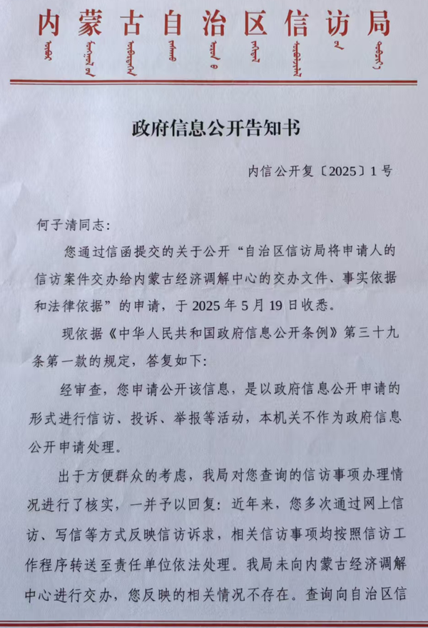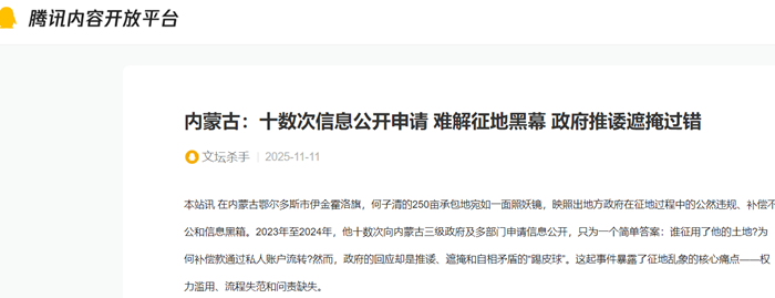 政府征地补偿本该透明公正,却沦为权力寻租的通道;信息公开本该保障公民知情权,却成了部门互踢的皮球。何子清一案,并非孤例,它是内蒙古乃至全国征地乱象的缩影——当政府以“发展”之名行强占之实,公民权益便成牺牲品。真相不大白,问责不落地,这类闹剧只会循环上演。何子清誓言穷尽法律途径:政府若不纠错,黑幕终将被撕裂。(记者魏民)