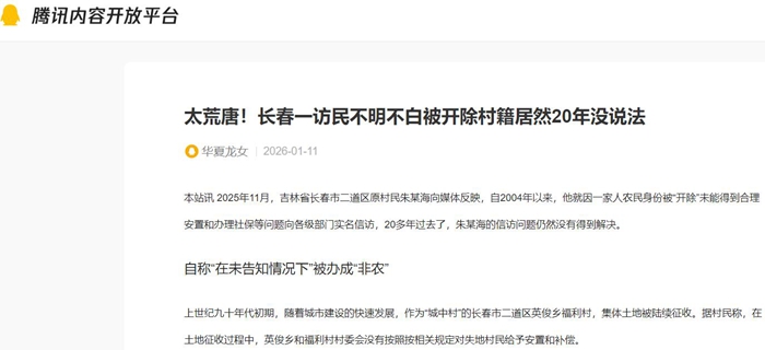 本站讯 2025年11月,吉林省长春市二道区原村民朱某海向媒体反映,自2004年以来,他就因一家人农民身份被“开除”未能得到合理安置和办理社保等问题向各级部门实名信访,20多年过去了,朱某海的信访问题仍然没有得到解决。