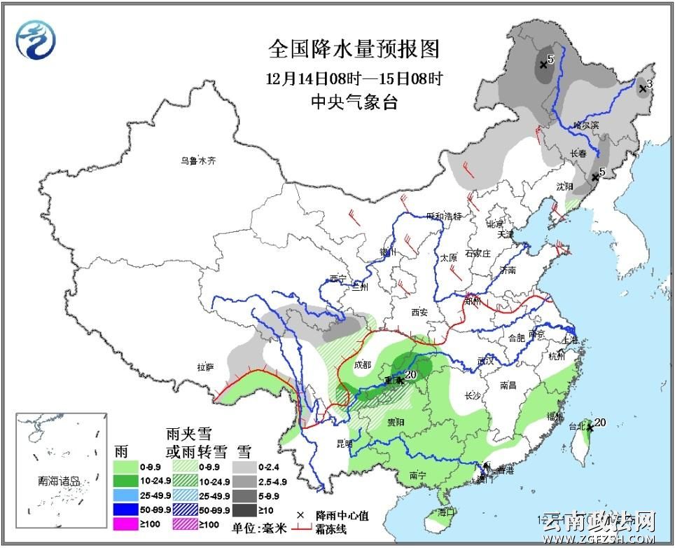 13日8时至14日6时,陕西中北部、山西中北部、内蒙古中部等地降雪或雨夹雪2~7毫米;四川盆地南部、江南中南部及广西东部、广东北部、台湾东部等地出现中到大雨。
