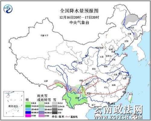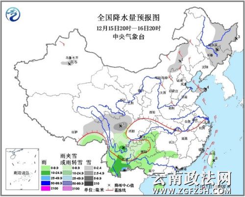 受南支槽和静止锋影响,15日夜间至16日,西南地区东部等地有小到中雨或雨夹雪,云南南部局地有大雨。