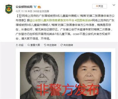 公安部刑侦局官方微博和公安部儿童失踪信息紧急发布平台官方微博11月18日上午发布消息称,网络上流传的广东增城被拐9名儿童案件嫌疑人“梅姨”的第二张画像非官方公布信息。