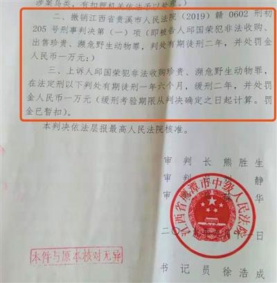 2018年8月25日,这起案件在贵溪市法院开庭,12月21日上午,一审开庭宣判,法院以犯非法收购、出售珍贵、濒危野生动物罪,分别判处邱国荣有期徒刑二年、罚金一万元,万锦龙有期徒刑一年零六个月、缓刑二年,罚金一万元。