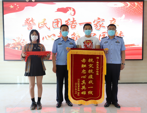 本网讯(朱善永报道) 2020年7月9日上午,一面印有“抗灾抗疫一线、赤胆忠心真英雄”的红色锦旗,由泰来镇25小时健身会馆的负责人送到了黑龙江省泰来县公安局副局长邸文明和政工室主任冯玉峰的手中。带着对民辅警的深情厚谊的一张张免费健身卡和一句句问候的话语,倾刻间也温暖了民警的心。