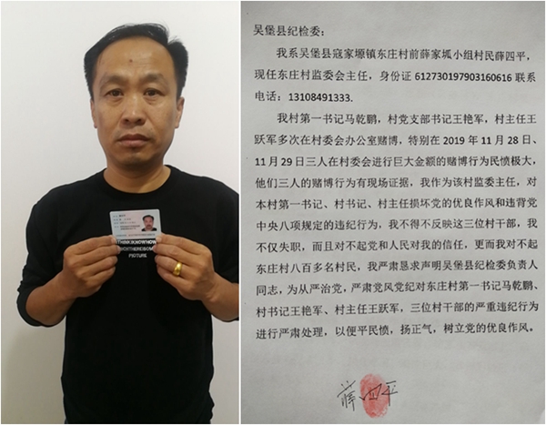 本站讯 2019年9月,多家媒体曾经刊发陕西省吴堡县人薛四平的实名举报(标题为《吴堡县寇家塬镇三名村干部聚众赌博诈骗国家巨额钱财》)。截至到记者发稿时,此事并没有得到处理,举报人称,这三名村官只是受到了党内警告处分,但是,还在继续做村官。