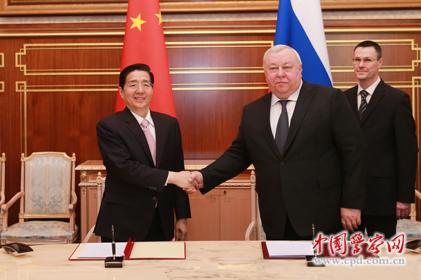 图为国务委员郭声琨与俄罗斯联邦麻醉品监管总局局长伊万诺夫举行会谈并签署部门间合作协议。人民公安报中国警察网记者 张建鑫 摄
