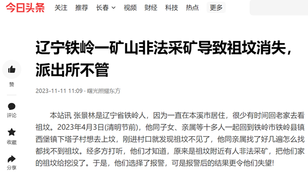 本站讯 2023年11月,多家网络媒体曾经以《辽宁铁岭一矿山非法采矿导致祖坟消失,派出所不管》为题,曝光了发生在...