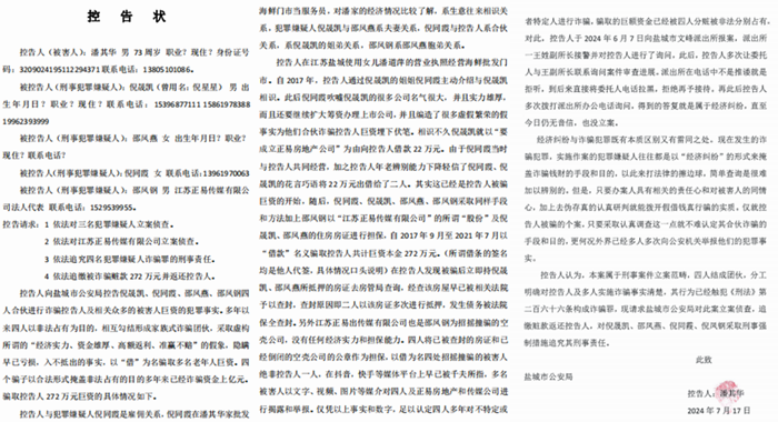 潘其华说,这四人就是骗钱的,四人结成团伙,分工明确对他及多人以借款的名义行骗的事实清楚,其行为已经触犯《刑法》第二百六十六条,构成诈骗罪,他请求盐城市公安局文峰派出所对此案立案侦查,追缴赃款返还控告人,对倪晟凯、邵凤燕、倪同霞、邵凤钢采取刑事强制措施,追究其刑事责任。