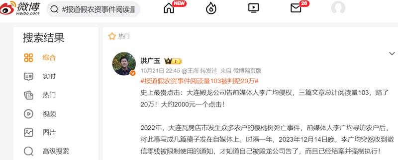 原文来自洪广玉新浪微博:https://s.weibo.com/weibo?q=%23%E6%8A%A5%E9%81%93%E5%81%87%E5%86%9C%E8%B5%84%E4%BA%8B%E4%BB%B6%E9%98%85%E8%AF%BB%E9%87%8F103%E8%A2%AB%E5%88%A4%E8%B5%9420%E4%B8%87%23