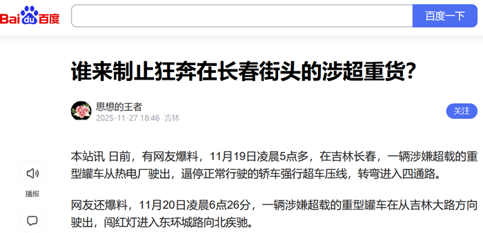 本站讯 日前,有网友爆料,11月19日凌晨5点多,在吉林长春,一辆涉嫌超载的重型罐车从热电厂驶出,逼停正常行驶的轿车强行超车压线,转弯进入四通路。