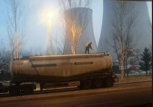 11月23日凌晨7点前后,记者根据线索行至吉林大路北侧的某加油站,可以看到加油站西侧墙外有多辆罐装重货在排队等待进入热电厂,据路过的行人称,这是等待进入热电厂拉煤灰的重型罐车,这些大车长16米左右,高四米多,车辆行走到身边感觉路面都颤动得吓人。