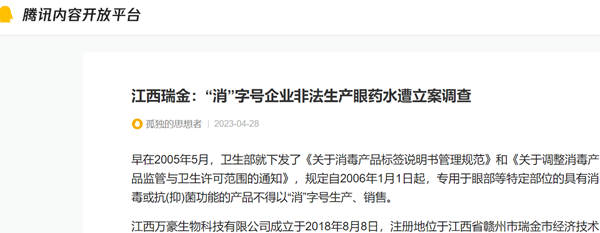 北京某律师认为,江西省瑞金市消毒产品企业利用“消”字号进行生产、销售护眼、养眼药水,说明书明显注明疗效,且未经卫生安全评价并备案,随意使用商标,又利用市场监管红线,注册多家生产和销售公司进行“身份”转换,躲避市场监管,规避追责风险。当地监管部门为了营商环境,一般惯例是采取低档位行政处罚。对于低档位处罚,涉事企业对违法成本几乎可以忽略不计。
