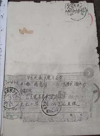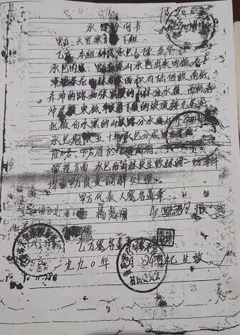 1990年8月24日,我们组的600余亩荒山承包给本组村民陈某华、杨某金、杨某华等10人造林。当天晚上,十个承包人还签名按手印。承包期限为20年,分为比例,本组全体村民占20%,大队占10%,林业站占20%,十个承包人占50%,乙方代表人陈某华,写协议人是陈某华的亲大哥陈某祥。1990年的那年,我们这里还没有电灯,照的是煤油灯,陈某祥写好读给大家听,年限和分为都没有错,接着村民代表就签字盖章。当时写的只有1份,一共2页。