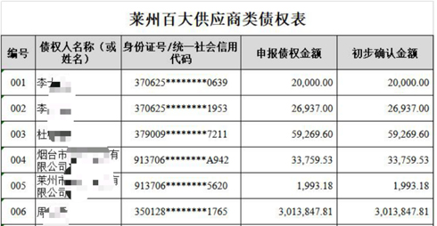 在莱州人满怀信心期盼自己的百大起死回生,重振雄威之际,百大集团却突然于2019年2月关门停业,在同年4月进入重整破产程序后,老百姓才恍然大悟,原来百大连年亏损竟高达8亿多元,其中非法集资1.8亿元,供货商未付款2.26亿元,职工工资保险0.8亿元,未消费购物卡金额0.8亿元……这不由让人倒吸一口凉气,多少个家庭和个人深受其殃!