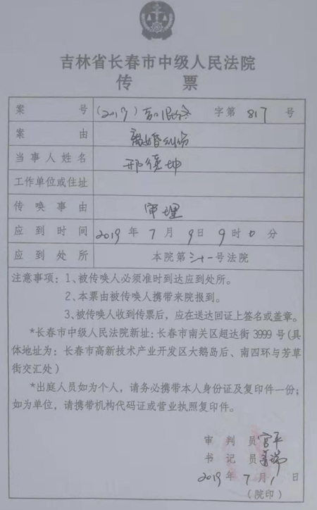 2019年4月,原告得到通知,该离婚上诉案将于2019年7月9日上午9:00点在长春市中级法院第31法庭开庭审理。当原告收到传票时很是感慨,该案尽管经过了漫长的8个月送卷、阅卷等繁杂的不可告人的所谓程序,还是等到了最终的开庭审理的消息,还算是不幸中的万幸,深信法律的正义只会迟到,不会缺席。可令人意想不到的是,在即将开庭的前一天(2019年7月8日),法庭通知原告取消次日的庭审。长春中级法院作为上诉法院,对上诉案既然已经决定开庭审理,况且又进行了必要的法律公告程序,3个月的公告期已过却无故取消开庭审理,没有任何合理合法的解释。这种不作为和司法腐败到了何种地步?一个普通离婚案纯属夫妻感情问题,况且子女与财产均无异议。被告是别有用心,才与法院勾结以达到她陷害原告之目的。她们这种权钱交易的勾当尽人皆知,否则,也不会出现这种比朝阳区法院更卑鄙的做法。无故取消庭审继续拖延,充分暴露了法院内个别人的贪腐,搞权钱交易,这何止是不作为?这简直就是在犯罪!利用一个离婚案在各级法院层层刮油,而满足掌权者的私欲与贪欲,更纵容了被告的别有用心与恶念。该离婚案自立案算起,初审两次耗时4年,上诉又拖了1年半,至今已5年了,仍无结果,实属罕见。