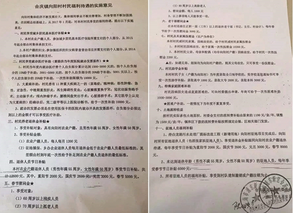 经向阳村村民联名请愿,2017年8月2日,向阳村民委员会公布《合庆镇向阳村村民福利待遇的实施意见》。该实施意见包括11项补贴,这些补贴虽名目繁多,但有些补贴需符合一定的条件,而针对征地补偿的项目金额不高。所以,村民享受的上述福利待遇与村委会代村民获得的各项收益(征地、租地及其他收益)相比较是非常的低。这样的福利待遇是不公平的,系村委会与民争地,与民争利。村民作为失地农民无安身立命之地,村委会给予的福利待遇却不能保障生活。