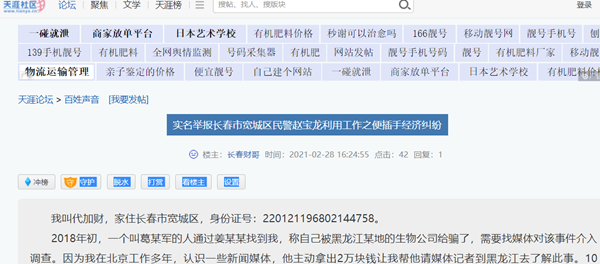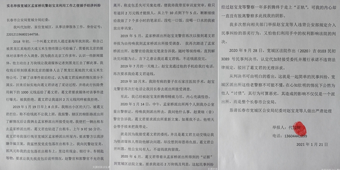 2020年1月21日,我向长春市宽城区公安局纪委实名举报赵宝龙等人违背公安部规定,介入民事纠纷,公然替他人催账的恶劣行为。