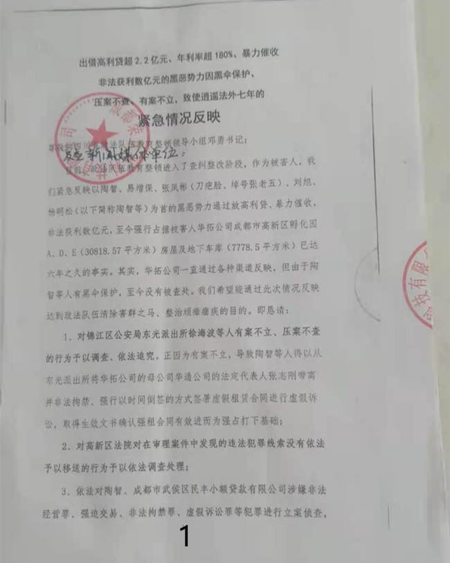目前,政法队伍教育整顿进入了查纠整改阶段,作为被害人,我们紧急反映以陶某、易某保、张某彬(刀疤脸、绰号张老五)、刘某、杨某松(以下简称陶某等)为首的黑恶势力通过放高利贷、暴力催收,非法获利数亿元,至今强行占据被害人华拓公司成都市高新区孵化园A、D、E(30818.57平方米)房屋及地下车库(7778.5平方米)已达六年之久的事实。其实,华拓公司一直通过各种渠道反映,但由于陶某等人有黑伞保护,至今没有被查处。我们希望能通过此次情况反映达到政法队伍清除害群之马、整治顽瘴痼疾的目的。即恳请: