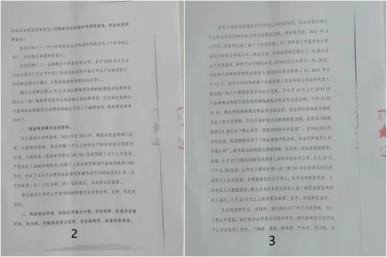 实名反映人二:成都荣立兴公司,系于2020年5月6日成功竞买了乐山市中级人民法院拍卖的华拓公司位于成都高新区科技孵化园9号楼C、D座的房屋的所有权的买受人。强行占有孵化园A、D、E只是以陶某等为首的黑恶势力犯罪事实的冰山一角!陶智等及民丰小贷公司涉嫌众多犯罪事实。仅仅通过能够公开查询的法院裁判文书网和华拓公司员工了解的情况,陶某等犯罪事实如下: