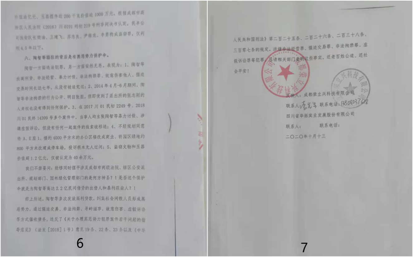 3、在2017川01民初2249号、2018川01民终14399号多个案件中,当事人均主张陶智等暴力讨债、涉嫌虚假诉讼,但没有任何一起案件的线索被移送;4、不经规划同意将A、E座1、楼约4000平方米的办公区楼改成商业、将园区绿地约800平方米改建成停车场,投诉根本无人过问;5、盗窃文物和玉器价值超1.2亿元,仅被认定为40余万元。