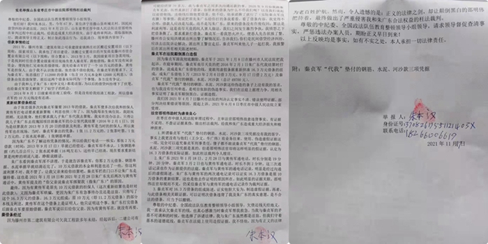 秦贞军“代我”垫付的钢筋、水泥、河沙款这些伪造的条子上没有我的签名,也与我没有任何牵连,是明目张胆的伪造事实。我们在法庭上据理力争,用相关事实证明了秦贞军颠倒黑白、证据造假。