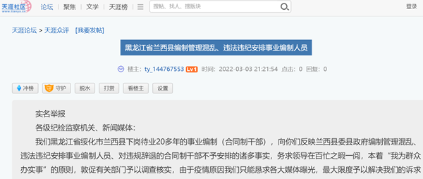 我们黑龙江省绥化市兰西县下岗待业20多年的事业编制(合同制干部),向你们反映兰西县委县政府编制管理混乱、违法违纪安排事业编制人员、对违规辞退的合同制干部不予安排的诸多事实,务求领导在百忙之暇一阅,本着“我为群众办实事”的原则,敦促有关部门予以调查核实。由于疫情原因我们只能恳求各大媒体曝光,最大限度予以解决我们的诉求问题。