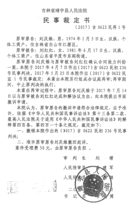 3、靖宇县法院2017年7月14日作出的(2017)吉0622民再1号民事裁定书。杨帆得知靖宇县法院(2017)吉0622民初236号民事判决的判决结果后,立即向靖宇县法院申请再审,要求靖宇县法院再审此案,依法撤销(2017)吉0622民初236号民事判决。但是,靖宇县法院在我国民事诉讼法规定的时限内,既没有对举报人的再审申请进行审查,更未对该案提起再审,却在2017年7月14日作出了(2017)吉0622民再1号民事裁定书,自行撤销了(2017)吉0622民初236号民事判决,并再次准许刘庆维撤回起诉。这个诉讼程序完全是刘红红和刘庆维与法官及法院主要领导相互勾结违法操作的。第一次起诉在举报人不同意转让股份的情况下,因为刘庆维受让刘红红的70%股权不能抗拒举报人对这70%股权的优先购买权。故此,为了避开举报人,刘庆维撤诉后又起诉,法官滥用职权没有将举报人追加为当事人参加诉讼,在没有举报人抗辩意见的情形下违法作出了(2017)吉0622民初236号民事判决。因为举报人作为股东对公司其他股东的股权享有法定的优先购买权,所以,举报人对靖宇县法院(2017)吉0622民初236号民事判决申请再审,靖宇县法院在未对举报人的再审申请进行审查、举报人也不知情的情况下又自行撤销了(2017)吉0622民初236号民事判决。在枉法判决生效期间,剥夺了举报人的法定代表人资格,并非法将淘汰设备拉到矿区,虚假登报探矿权证丢失,虚假登报增资扩股,以达到霸占矿山的目的,导致弘泰矿业矿山建设停工至今,造成巨大经济损失。