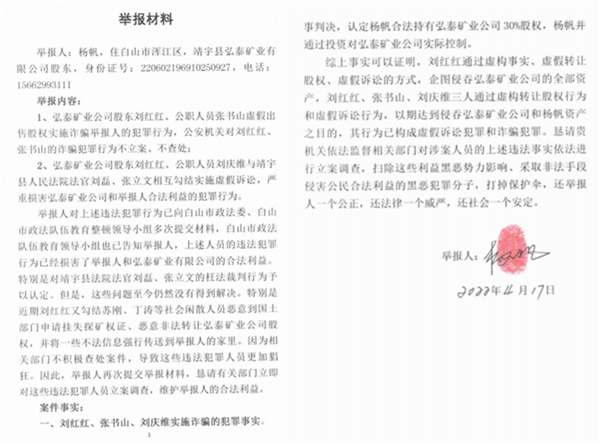 综上事实可以证明,刘红红通过虚构事实、虚假转让股权、虚假诉讼的方式,企图侵吞弘泰矿业公司的全部资产,刘红红、张书山、刘庆维、苏刚通过虚构转让股权行为和虚假诉讼行为,以期达到侵吞弘泰矿业公司和杨帆资产之目的,其行为已构成虚假诉讼犯罪和诈骗犯罪。刘红红、苏刚、刘庆维、丁滔犯罪团伙的主谋袁凤友已被中央扫黑办指定异地公安机关立案侦查,现已批捕,在光天化日之下,将他人企业的股权在他们之间互相“转让”,经靖宇县法院个别法官和领导的参与枉法判案。在当今法治社会白山辖域内仍然还有赤裸裸的诈骗犯罪事件发生,令人发指。恳请贵局依法监督相关部门对涉案人员的上述违法事实依法进行立案调查,扫除这些利益黑恶势力影响、采取非法手段侵害公民合法利益的黑恶犯罪分子,打掉保护伞,还举报人一个公正,还法律一个威严,还社会一个安定。