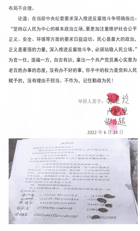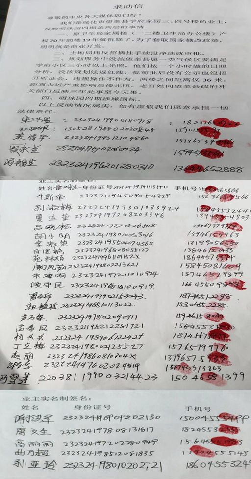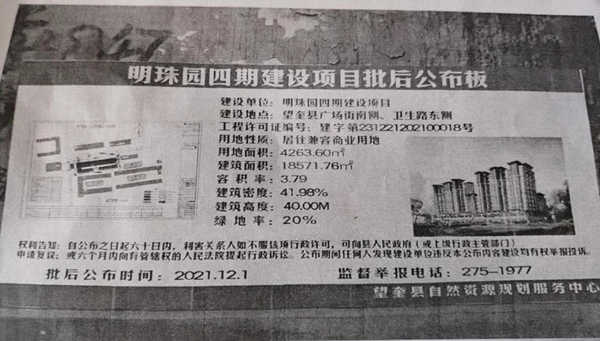 望奎县自然资源局文件(望自然资发{2021}75号,局长李永峰签发)“信访事件处理意见书”内容是:“签朱艳红女士的信访问题;“您于2021年8月2日,反映望奎县明珠园(四期)在没有政府批件的情况下,没有取得建设用地规划许可,工程规划许可证等审批手续分发施工并2021年4月6日公示牌,要建80米高层”。经调查核实,望奎县明珠园(四期)建设项目,该项目经县主要领导现场办公及望奎县规划委员会的意见,已作出规划方案调整,调整后明珠园(四期)建设项目拟建12层,限高40米以下。”2022年5月18日,学府小区5名业主到信访局反映明珠园4期违规建筑一事,信访局工作人员态度生硬并让我们上交手机。徐野县长组织的协调会上规划服务中心徐永进,自然资源局长付啸宇,住建局姜春光等三位局长都向我们说,他们就这么给答复了,如不同意可以向纪检部门举报他们。同时,自然资源局下午给我们下达的文书(〈望自然资发(2022)65号文件,望建信(2022)28号文件,望城规函(2022)4号文件),并于2021年7月19日作出调整后的批前公示,现土地手续已办理。我们想问问给谁的手续已办理?难不成还是盗卖国土未批先建的鼎方公司吗?