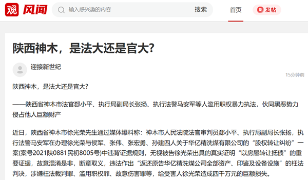 近日,陕西省神木市徐光荣先生通过媒体爆料称:神木市人民法院法官审判员郄小平、执行局副局长张扬,执行法警马安军在办理徐光荣与侯军、张伟、张宏勇、孙建四人关于华亿精洗煤有限公司的“股权转让纠纷”一案(案号2021陕0881民初8005号)中违背证据规则,无视被告徐光荣出具的真实证明“以房屋转让抵债”的重要证据,故意混淆是非,断章取义,违法作出“返还原告华亿精洗煤公司全部资产、印鉴及设备设施”的枉法判决,涉嫌枉法裁判罪、滥用职权罪、故意伤害罪等,给受害人徐光荣造成四千万元的巨额损失。