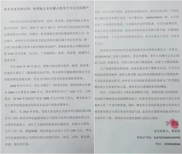无独有偶,神木市公安局孙家岔个别民警,倚仗上述错误判决,带领多名干警甘当张伟等四人的保护伞和帮凶,多次辱骂、殴打徐光荣的母亲郭爱爱。据老人回忆,她当时在华亿能源有限公司受聘照看设备和机器,在阻挡干警暴力执法时,被神木市公安局孙家岔派出所干警带上手铐,拉到没有监控的房间里,用膝盖压住腰部进行长时间的殴打。特别是12月28日夜晚,孙家岔派出所干警对郭爱爱进行长时间的暴力殴打,看到老人晕倒、口吐鲜血,怕惹上人命官司,遂叫120把老人拉到大柳塔某医院后扬长而去……孙家岔派出所还协助张伟等四人将受害人尼桑、现代两部越野车围土填埋,强行铲断电线,挖断水源,破坏生产,无恶不作,他们没事就开车来厂区转悠,帮黑恶势力“看家护院”,只要张伟等人打个电话,派出所干警随叫随到,嚣张跋扈的帮其“解决问题”。这期间,徐光荣等受害人多次向神木市公安局孙家岔派出所所长郄应文(手机号:13109200018)反映情况,但都被拒绝出警,郄所长甚至叫嚣:“有甚问题你就去告!天王老子来了额都不怕!”