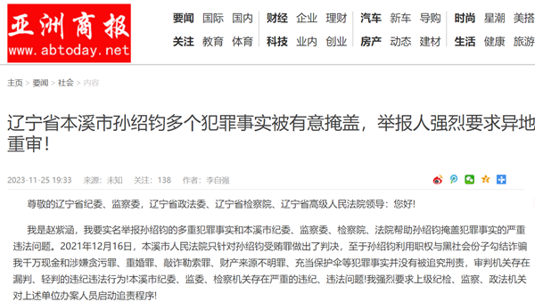 我是赵紫涵,我要实名举报孙绍钧的多重犯罪事实和本溪市纪委、监察委、检察院、法院帮助孙绍钧掩盖犯罪事实的严重违法问题。2021年12月16日,本溪市人民法院只针对孙绍钧受贿罪做出了判决,至于孙绍钧利用职权与黑社会份子勾结诈骗我千万现金和涉嫌贪污罪、重婚罪、敲诈勒索罪、财产来源不明罪、充当保护伞等犯罪事实并没有被追究刑责,审判机关存在漏判、轻判的违纪违法行为!本溪市纪委、监委、检察机关存在严重的违纪、违法问题!我强烈要求上级纪检、监察、政法机关对上述单位办案人员启动追责程序!