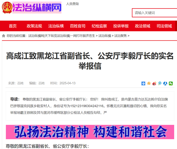 我叫高成江,是内蒙古莫力达瓦达斡尔自治旗巴彦鄂温克民族乡乾安村人,身份证号为152123196304242116。怀着无比沉重和恳切的心情,我向您实名举报“地霸”王铁刚及其与黑河市瑷珲区部分公检法人员相互勾结,严重侵害我及其他种地户合法权益的一系列违法犯罪行为,恳请您能在百忙之中关注此事,彻查真相,为我们主持公道 。