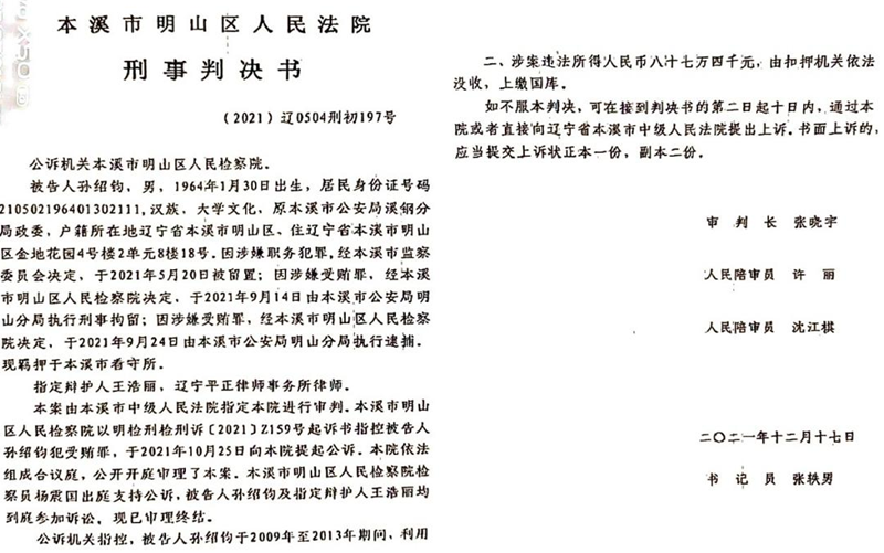 2021年5月13日,赵紫涵向本溪市纪委实名举报孙绍钧贪污、受贿、重婚、诈骗、充当保护伞,并提交了充足的犯罪证据。2021年9月,本溪市纪委监委只针对孙绍钧受贿罪向本溪市明山区检察院移交,其他罪名忽略不计,也没有任何解释。根据《中华人民共和国刑法》第三百八十三条规定,受贿87.4万元应属“数额巨大”,判处三年以上十年以下有期徒刑,但是2021年12月17日明山区法院只判了孙绍钧三年有期徒刑,取最低线,属重罪轻判!