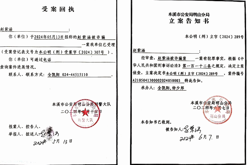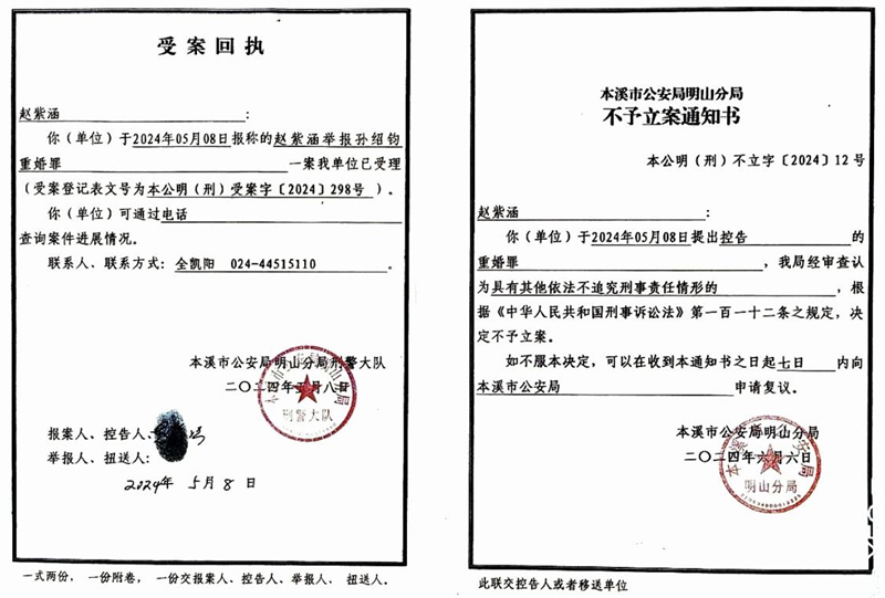 2024年5月13日,对于孙绍钧诈骗罪、重婚罪,本溪市公安局明山分局刑警队受理了案件,2024年6月7日,诈骗罪正式立案,并且做了详细笔录。2024年6月7日,刑警队对孙绍钧诈骗案,开始立案侦查。2024年8月5日,赵紫涵向明山分局办理案件某警官打电话追问案件结果,明山分局回复案件正在推进。