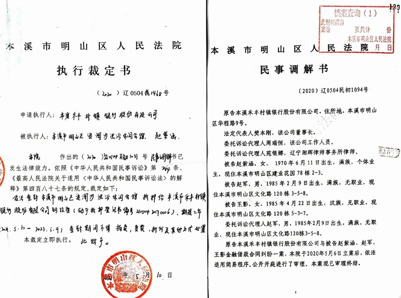 2022年11月19日,赵紫涵接到明山区法院的执行裁定书,马上联系明山法院执行局的法官曲靖武(法院的法警),询问是什么情况,为什么拍卖两次都不通知赵紫涵及其代理人并且流拍了还以物抵债呢?更恶劣的是两处房产、两个抵押分别是600万和498万,而明山法院执行局却让本溪禾丰村镇银行以749.532万元的价格将两处房产以物抵债,却只清了一笔498万的贷款,那笔600万的贷款没清而抵押房产却不翼而飞了,这是银行、法院、律师、拍卖公司弄虚作假、违纪、违法的典型案例。
