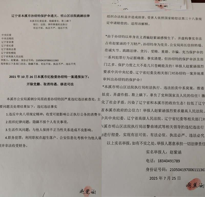 2021年5月13日,赵紫涵向本溪市纪委实名举报孙绍钧贪污、受贿、重婚、诈骗、充当保护伞并提交了充足的犯罪证据,其中就有孙绍钧诈骗赵紫涵1000多万元人民币这项。2021年9月,本溪市纪委监委只针对孙绍钧受贿罪向本溪市明山区检察院移交,没有诈骗和其它罪一说,赵紫涵逐级上告。2024年2月份,赵紫涵到辽宁省检察院控诉中心,实名举报孙绍钧多项犯罪,省检察院两位领导接见并且指出案件走向,让赵紫涵回到本溪市明山分局刑警队立案,赵已经向警方提交了真实证据。