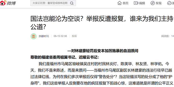 为什么林建豪触犯国法却能轻描淡写过关?为什么我们举报犯罪还要遭报复?为什么监督者对我们的举报如此敷衍?