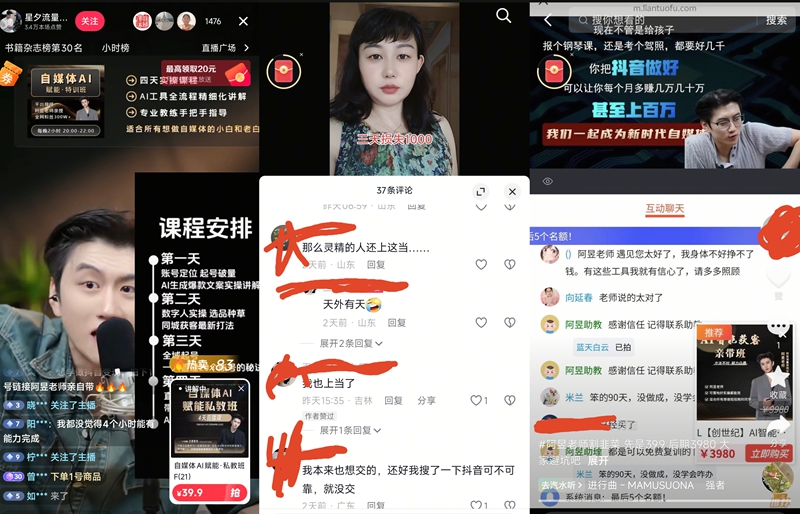 发现自己被骗后,我上网搜了一下,发现和我一样上当受骗的人还有很多,阿昱好几个抖音账号都在直播卖这个课,每天循环不停的讲。我在想这得有多少人都在上当啊,这都是老百姓的血汗钱啊。