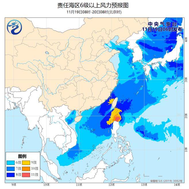 今年第26号台风 “海鸥”将于19日傍晚前后在吕宋岛北部沿海登陆(25-30米/秒,10-11级,强热带风暴级),之后移入南海。受冷空气和台风 “海鸥”的共同影响,19日白天至夜间,东海南部、台湾海峡、台湾以东洋面、南海东北部和中东部将有7~8级、阵风9~10级的偏北到东北风,部分海域风力可达9~10级、阵风11级大风,台风中心经过附近海域风力可达11~12级、阵风13~14级;另外,渤海海峡、黄海部分海域、东海北部、北部湾、南海西部将有7级、阵风8级的西北到东北风(见图1)。中央气象台11月19日06时继续发布台风蓝色预警和海上大风预报。