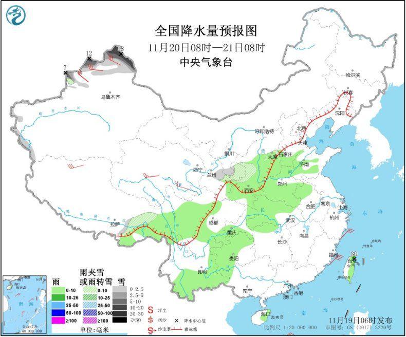 图2 全国降水量预报图(11月19日08时-20日08时)
