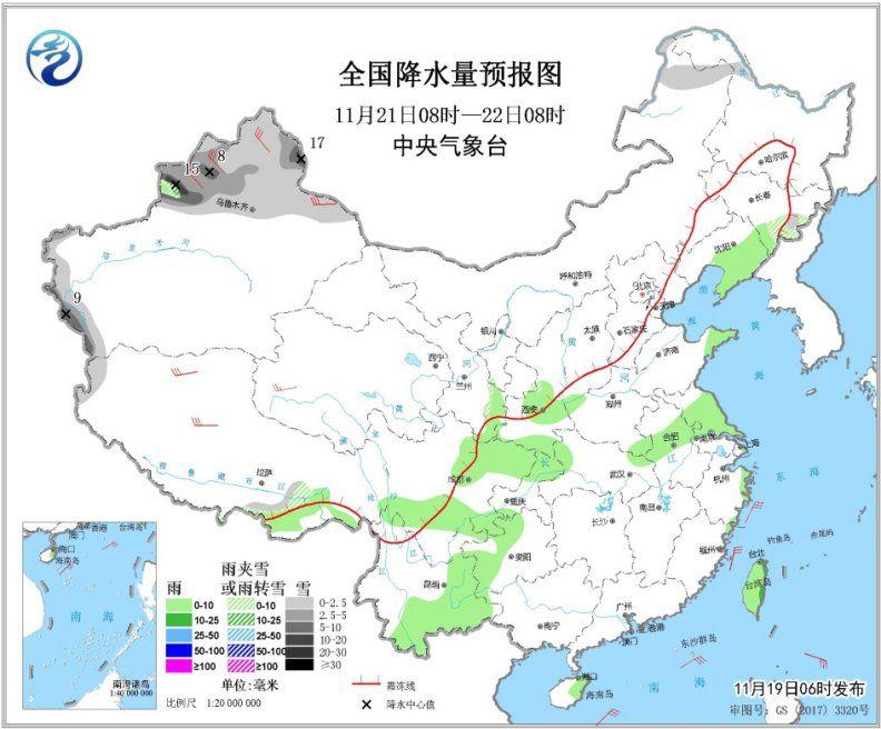 11月20日08时至21日08时,新疆北部和南疆盆地西部山区、西藏东南部、西北地区东部等地部分地区有小到中雪或雨夹雪,其中,新疆北疆北部和东部等地局地有大雪或暴雪(10~18毫米)。西藏东部、西北地区东南部、华北南部、黄淮大部、江淮西部、江汉大部、川西高原大部、贵州西部、云南东部和南部、重庆、海南岛东部、台湾岛东部等地部分地区有小到中雨,其中,台湾岛东北部局地有大雨(25~30毫米)。新疆北部、西藏北部、青海南部等地部分地区有4~6级风。台湾海峡、巴士海峡、南海东北部和中东部海域将有7~8级、阵风9级的东北风(见图3)。