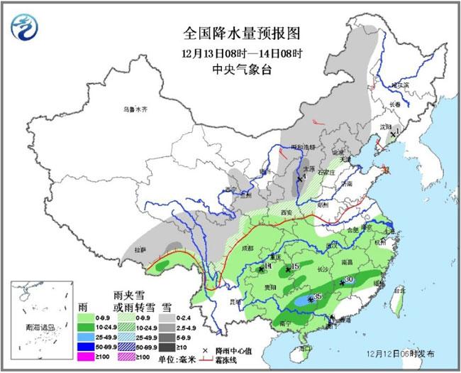 12日08时至13日08时,新疆东部、西北地区大部、内蒙古西部、西藏东部等地有小到中雪或雨夹雪,其中,甘肃东部和南部、宁夏南部等地的部分地区有大雪;江南中西部、江汉西部、华南中西部、西南地区东部、西藏东南部等地有小到中雨。新疆东部、内蒙古西部、甘肃西部等地有4~6级风。